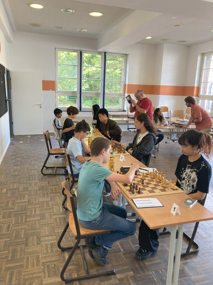 Ca. eineinhalb Stunden können die sehr jungen Katernberger mithalten. Dann beginnen die Partien zu unserem Gunsten zu kippen. Emilia erzielt dann am 4. Brett die Werdener Führung. Mit einem starken Königsangriff kann sie zuerst die gegnerische Dame und kurz darauf die Partie gewinnen. Daniela hat am 2. Brett auch schon eine Figur mehr und sammelt noch eine Qualität ein. Kurz darauf steht es 2:0. Bei Clara und Viktor sieht es noch gleich aus. Eine halbe Stunde später kann Clara ihr Damenendspiel gewinnen (-> 3:0). Viktor hat einen Turm mehr, muss aber bis zum Matt kämpfen.
